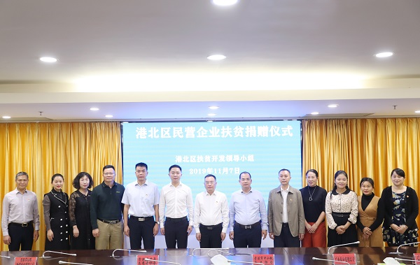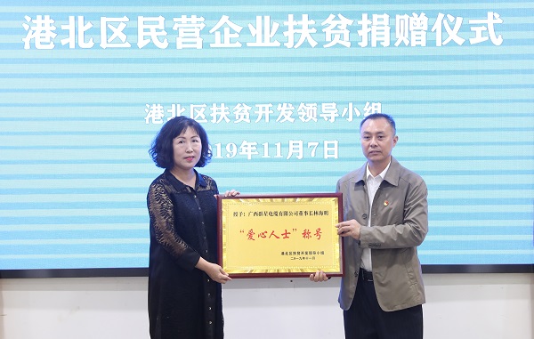 2019年11月7日,我公司潘俊燕女士參加廣西貴港市港北區(qū)民營企業(yè)扶貧捐贈儀式,并代表林海明董事長接受港北區(qū)扶貧開發(fā)領(lǐng)導(dǎo)小組授予的“愛心人士”稱號牌匾。